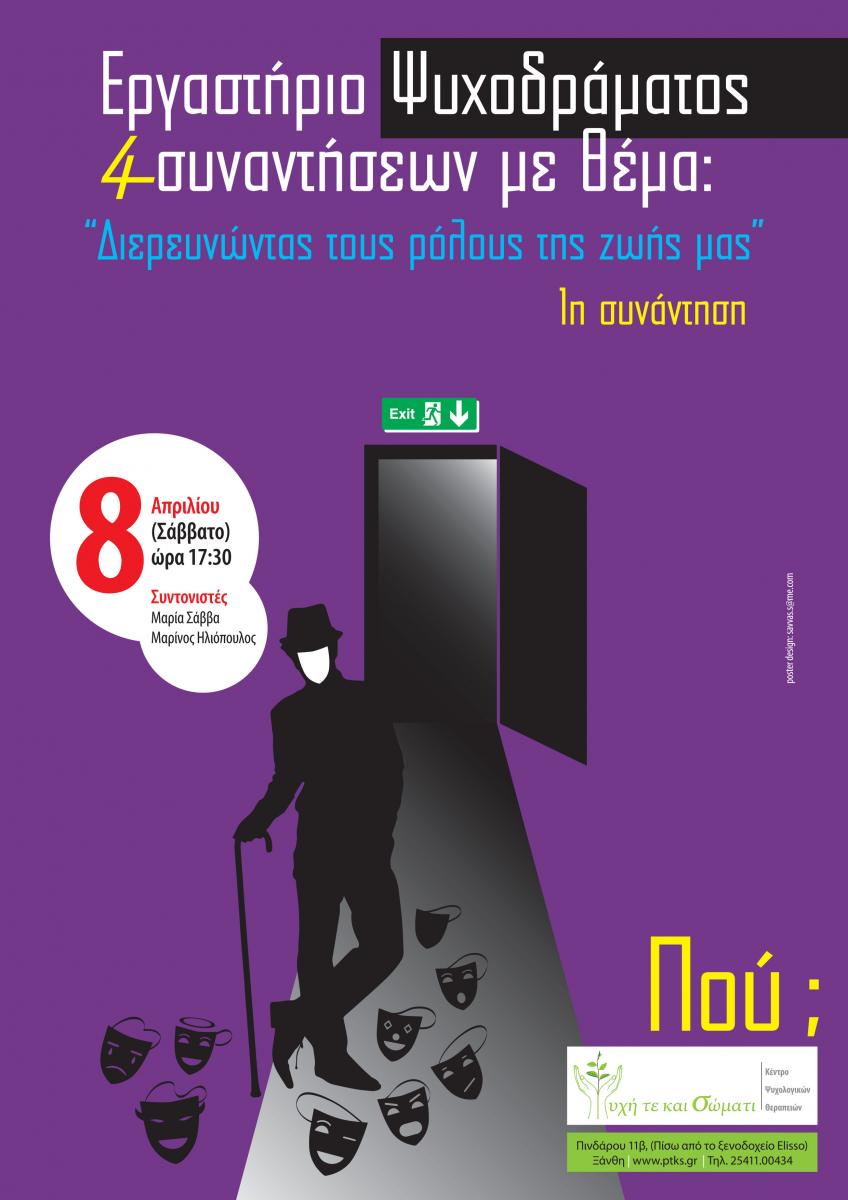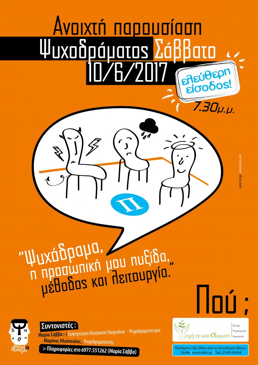 Ανοιχτή παρουσίαση Ψυχοδράματος το Σάββατο 10 Ιουνίου 2017 στις 19:30 στο Κέντρο "Ψυχή τε και σώματι" με θέμα: “Ψυχόδραμα, η προσωπική μου πυξίδα, μέθοδος και λειτουργία.” Είσοδος ελεύθερη.